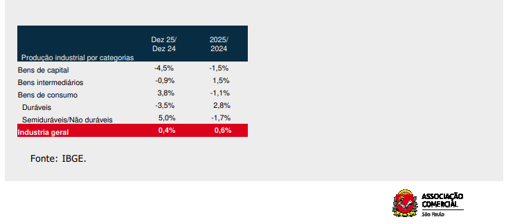 A Pesquisa Industrial Mensal (PIM), divulgada pelo Instituto Brasileiro de Geografia e Estatística (IBGE), revelou uma queda na produção industrial, em dezembro, de 1,2%, em relação a novembro, e um aumento de 0,4% na comparação com o mesmo mês do ano anterior, com um dia útil a mais. O setor industrial terminou 2025 com uma expansão de 0,6%, com crescimento de 4,9% da indústria extrativa, e queda de 0,2% da indústria de transformação. Esses resultados vieram abaixo das expectativas do mercado.