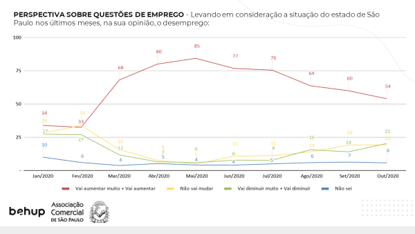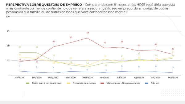 Outro tema importante do estudo refere-se ao desemprego. Foi pedido que se comparasse seis meses atrás com hoje e, então, que as pessoas dissessem se achavam que havia mais ou menos confiança no que se refere à segurança do seu emprego, do emprego de outros membros da família ou de outros conhecidos. Do total, 41% disseram que estão muito ou um pouco menos confiante contra 46% em setembro. Os que responderam muito mais ou um pouco mais chegaram a 31% em outubro ante 27% do mês passado. Além disso, 54% das famílias acham que aumentará o número de pessoas sem emprego. O percentual ainda é elevado, mas melhorou bastante em relação ao que era em abril e maio (80% e 85%, respectivamente).