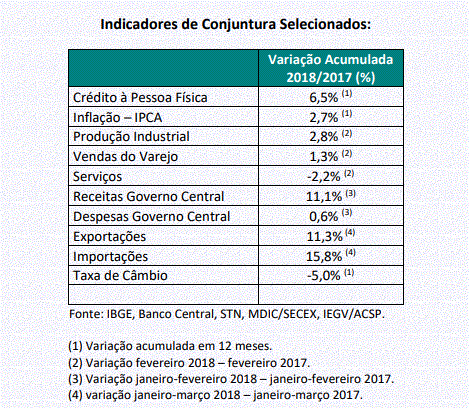 De acordo com o IBGE, em fevereiro, a indústria registrou alta de 2,8%, ante o mesmo mês de 2017, frustrando as expectativas. Novamente se destacaram os bens duráveis, cuja produção cresceu 15,6%, principalmente devido ao aumento da fabricação de veículos (16,8%). Também se destacou o segmento de bens de capital (7,8%).O resultado acumulado em 12 meses seguiu subindo, com alta de 3,0%, ante 2,8% registrado na leitura anterior.