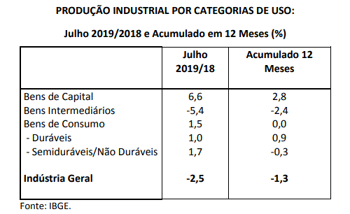 De acordo com a Pesquisa Mensal da Indústria (PMI) do Instituto Brasileiro de Geografia e Estatística (IBGE), em julho, na comparação com o mesmo mês de 2018, a atividade industrial mostrou queda de 2,5% (ver tabela abaixo), mesmo dispondo de um dia útil adicional, embora menor do que a registrada no mês de junho.