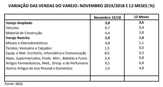 Segundo o Instituto Brasileiro de Geografia e Estatística (IBGE), em novembro, os volumes de vendas do varejo restrito (que não inclui veículos e material de construção) e do ampliado (que inclui todos os segmentos) registraram altas de 2,9% e 3,8%, respectivamente, sobre o mesmo mês de 2018 (ver tabela abaixo). Em 12 meses, houve leve perda de intensidade do crescimento de ambos tipos de varejo (1,6% e 3,6%, respectivamente), em relação a outubro.