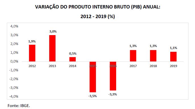 De acordo com dados do Instituto Brasileiro de Geografia e Estatística (IBGE), o Produto Interno Bruto (PIB) cresceu 0,5%, durante o quarto trimestre do ano, em relação ao terceiro, livre de efeitos sazonais, em linha com as expectativas de mercado, que já esperavam desaceleração nos últimos três meses do ano passado. Durante 2019 o aumento foi de 1,1%, abaixo dos resultados de 2017 e 2018 (1,3% em ambos casos – ver gráfico abaixo).