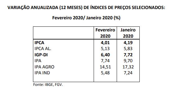 Em síntese, a inflação oficial (IPCA), apesar de acelerar em fevereiro, não preocupa, por tratar se de efeito puramente sazonal. O IGP-DI também mostra arrefecimento na alta de preços no atacado. A nova safra agrícola recorde, a queda dos preços das matérias primas no mercado internacional, a elevada ociosidade da economia e o impacto possivelmente deflacionário do coronavírus deverão manter a inflação em patamares baixos, apesar da forte elevação do dólar, que eleva os custos de produção, aumentando a pressão por repasses aos preços finais.