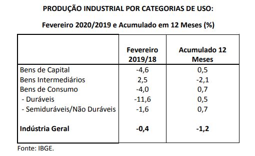 Segundo o Instituto Brasileiro de Geografia e Estatística (IBGE), em fevereiro, no comparativo anual, a atividade industrial mostrou contração de 0,4% (ante expectativa de retração de 2,5%). No acumulado dos últimos 12 meses, também houve queda (-1,2%), embora ligeiramente maior do que a observada na leitura anterior. Esses resultados se explicam tanto pela existência de dois dias úteis a menos em relação ao mesmo mês de 2019, devido ao Carnaval, como pela baixa demanda interna e externa. Também foram sentidos os primeiros efeitos negativos do coronavírus, que reduziram a oferta de componentes importados da China.