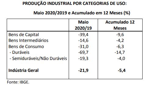 Do ponto de vista mensal, a expansão se explica fundamentalmente pela menor base de comparação de abril, e pela existência de dois dias úteis a menos, enquanto o resultado anual continuou refletindo os efeitos negativossobre a produção industrial do isolamento social, em decorrência da pandemia. Em todo caso, a retração do setor foi relativamente menor em maio, pois neste mês houve abertura incipiente das fábricas.