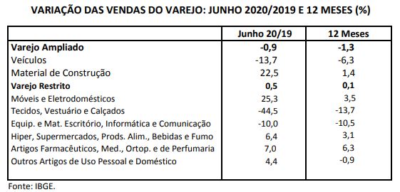 Segundo o Instituto Brasileiro de Geografia e Estatística (IBGE), em junho, o varejo restrito (que não inclui veículos e material de construção) anotou leve alta de 0,5% sobre o mesmo mês de 2019, superando as expectativas, enquanto o varejo ampliado (que incorpora todos os segmentos) apresentou recuo de 0,9% (ver tabela abaixo). Em relação a maio, livre de efeitos sazonais, continuou a haver forte aumento dos volumes comercializados (8,0% e 12,6%, respectivamente). Em 12 meses, seguiu havendo estabilidade no varejo restrito, e queda levemente mais intensa que a observada na leitura anterior, no caso do ampliado (-1,3%).