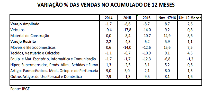 Enquanto Tecidos, Vestuário e Calçados (9,1%), Farmácias e Perfumarias (8,0%) e Artigos de Uso Pessoal e Doméstico (8,1%) apresentaram resultados positivos em novembro, os Equipamentos e Material de Escritório e Informática e Comunicação registraram retração de 6,8¨% nas vendas de novembro, possivelmente pela redução dos investimentos das empresas em decorrência da recessão. Desempenho negativo (-2,3%) também se verificou no tocante Livros, Jornais, Revistas e Papelaria, que não apresenta sinais de que vá se recuperar no curto prazo.