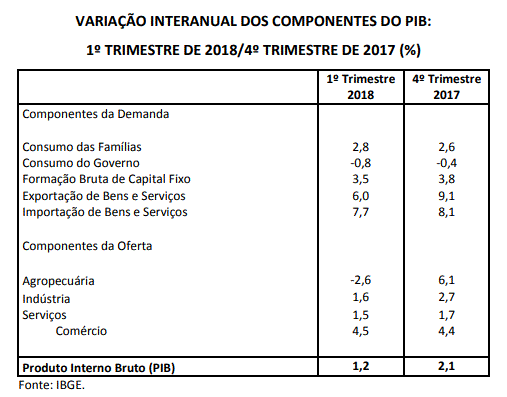 Sendo o PIB a soma de todos os bens e serviços produzidos e consumidos no País, seu desempenho deve ser analisado em termos de seus componentes de demanda e de oferta. Na Tabela abaixo, apresentamos a comparação entre as variaçõesinteranuais do período janeiro-março de 2018 e do quarto trimestre de 2017, onde é notória a perda de ritmo.